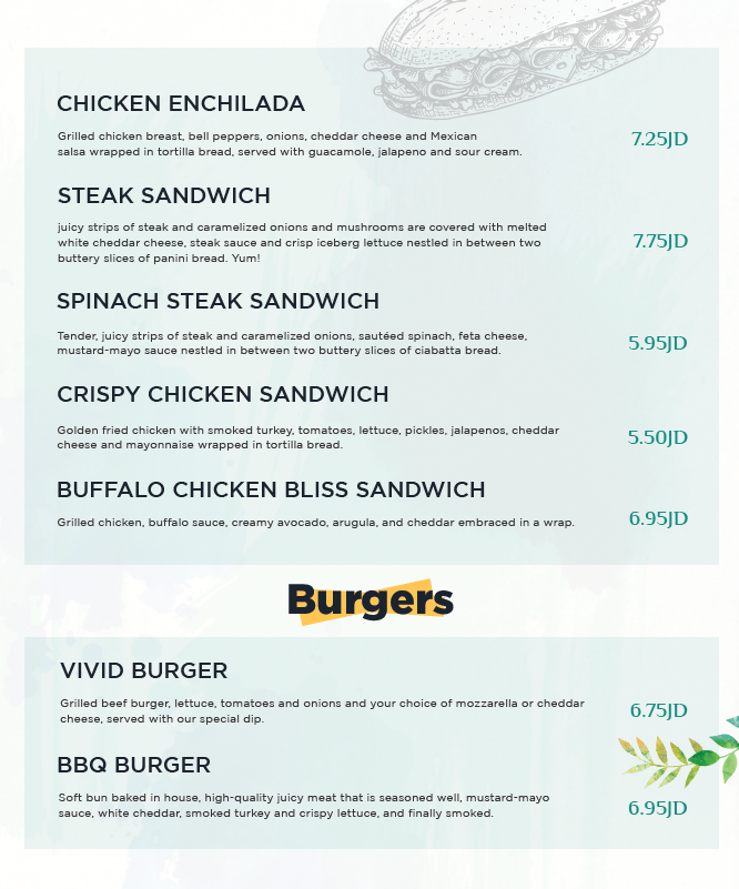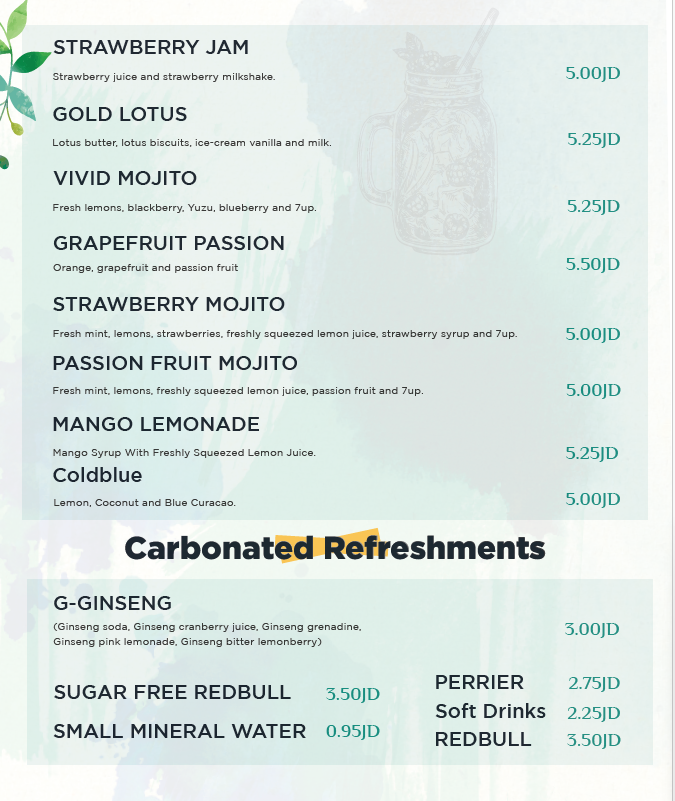 Introducing the menu at Vivid Restaurant & Lounge, located on Hammam Ben Menyah St. in Amman, Jordan, promises an array of tantalizing flavors to delight every palate. This vibrant eatery boasts a dynamic selection of smoothies, pastas, and salads that cater to both casual diners and those seeking a memorable meal.